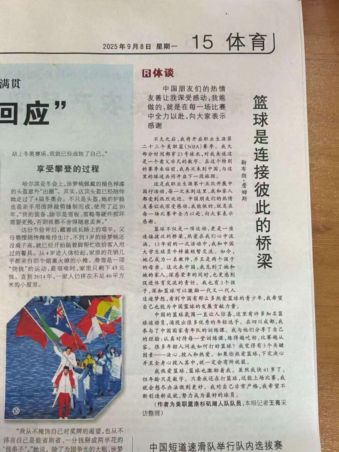 根据ESPN和The Athletic的报道,一,内容是属实的,只是并非某个新闻媒体独有;二,詹姆斯没有向《人民日报》投稿。其实这个说法契合了《篮球是连接彼此的桥梁》的报道模式,文章末,明确写了“作者为美职篮洛杉矶湖人队队员,本报记者王亮采访整理”。