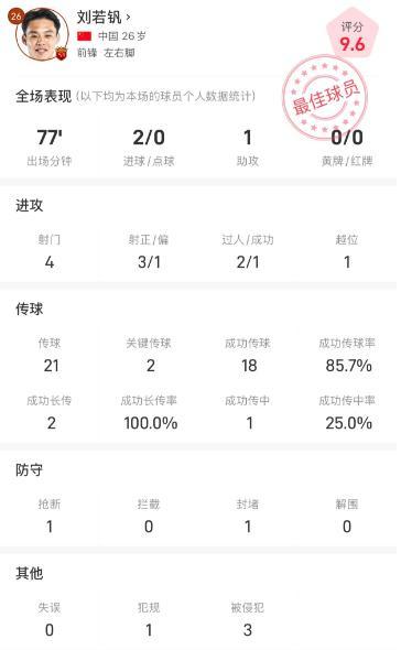 本场比赛,刘若钒出场77分钟,贡献2球1助攻。在77分钟里,刘若钒有4次射门,3次射正就打进2球。在进攻端,刘若钒有过2次过人,其中成功1次,另外还有一次越位。