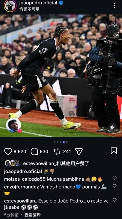 上演帽子戏法的若昂·佩德罗社媒晒照,恩佐、凯塞多等众队友点赞 xiaoqiao 2026-03-07 英超 15 0 3月5日讯 在本轮英超,切尔西4-1大胜维拉。本场比赛若昂·佩德罗贡献3射1传,赛后他也在个人社媒晒出庆祝进球照片,恩佐、凯塞多、埃斯特旺等诸位队友都为其点赞评论,其中恩佐写道:“加油兄弟,进球越来越多!”