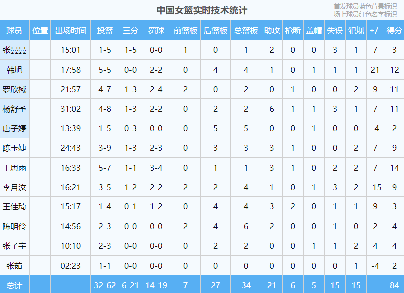 球员数据统计,王思雨14分1板3助、韩旭12分4板1助、杨舒予11分2板6助、罗欣棫11分2板、李月汝9分4板1助、陈玉婕9分3板3助、陈明伶4分6板2助、张子宇4分2板、王佳琦3分4板3助2断、张曼曼3分1板2助、唐子婷2分5板、张茹2分