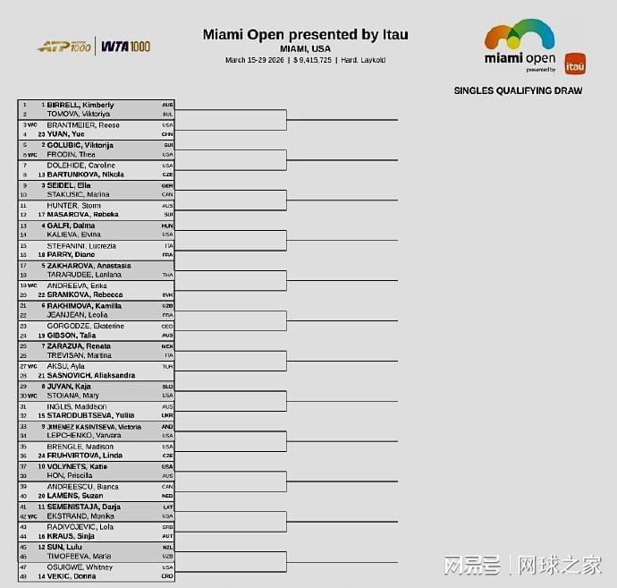 我们再来关注下周赛事。北京时间今晨,WTA1000迈阿密站公布了单打资格赛签表,中国金花袁悦将与安德莱斯库、维基奇等球员一同出战,争夺正赛席位。